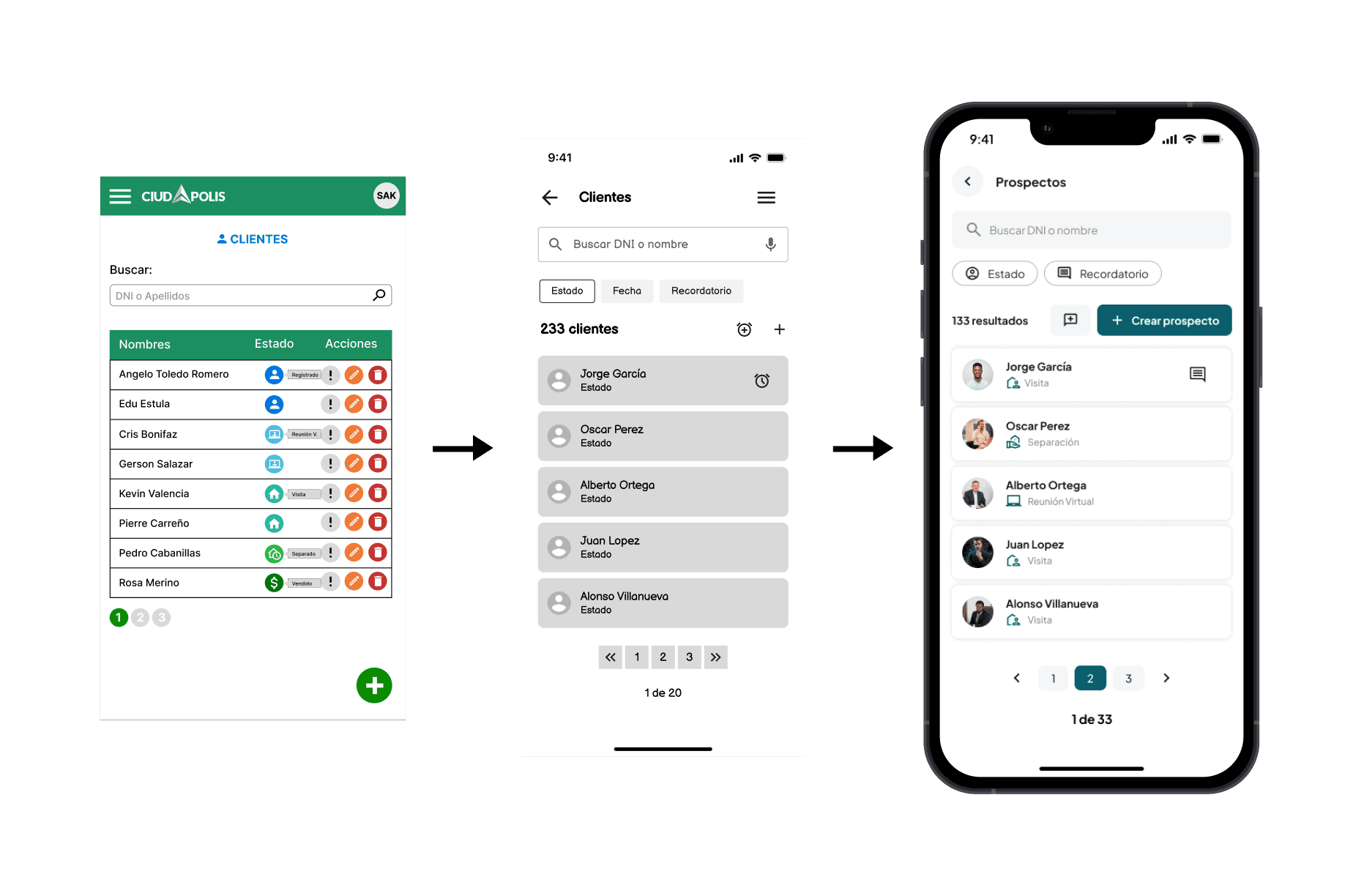 Here’s a high-level look at the redesigned Ciudapolis app for consultant's flows. The interface reflects all the improvements driven by research, testing, and stakeholder feedback, from dashboard KPIs to client creation, date filtering, and interaction feedback.