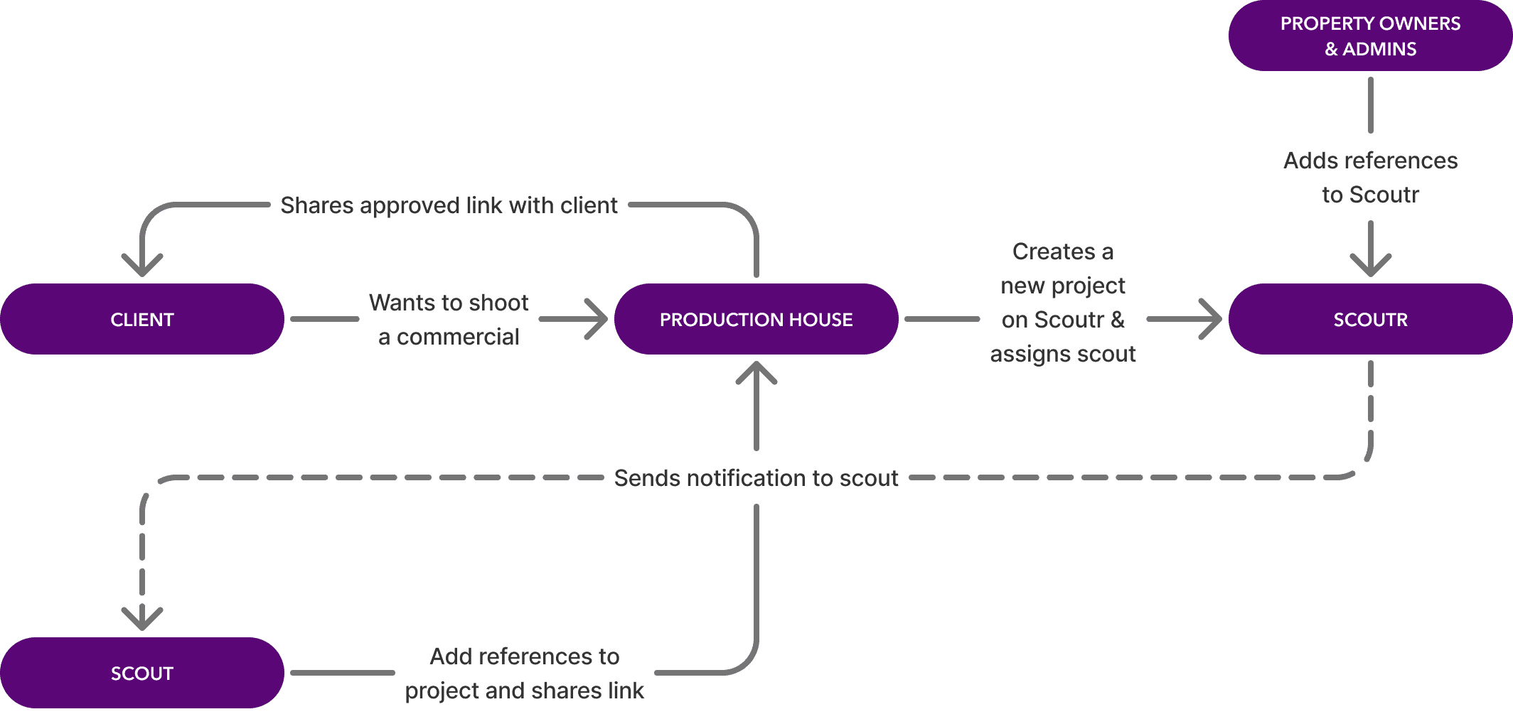 Five completely different roles, the Scout, the Client, the Production House, the Property Owner, and the Admin, all had to work together in one platform. So, I initially diagramed this high-level flowchart to validate the platform's architecture before moving into the user flows per role.