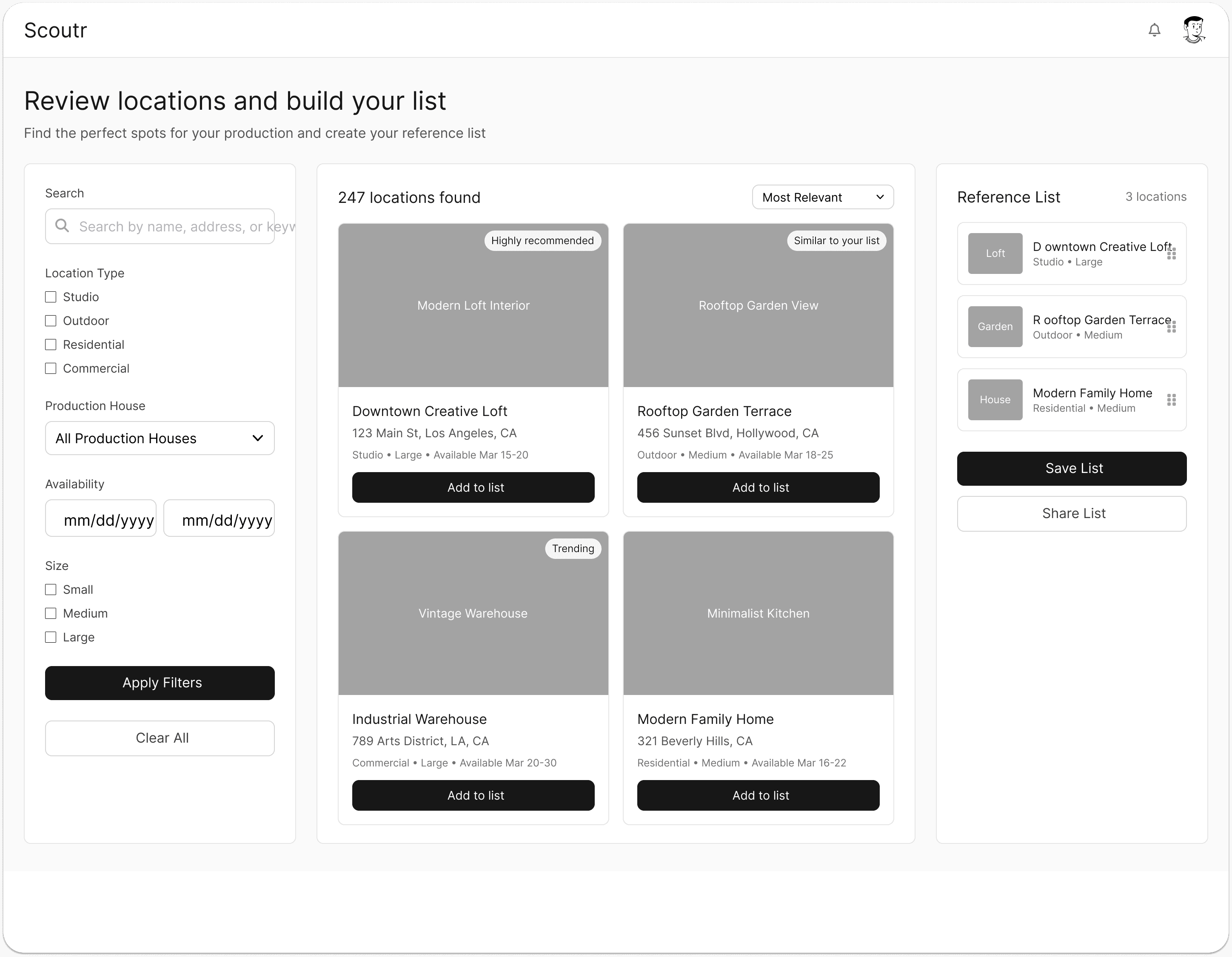 Scoutr, a Toronto-based startup, wanted to fix that. The goal was to build a centralized app where scouts could instantly compile, manage, and present location options in a clean, professional format.