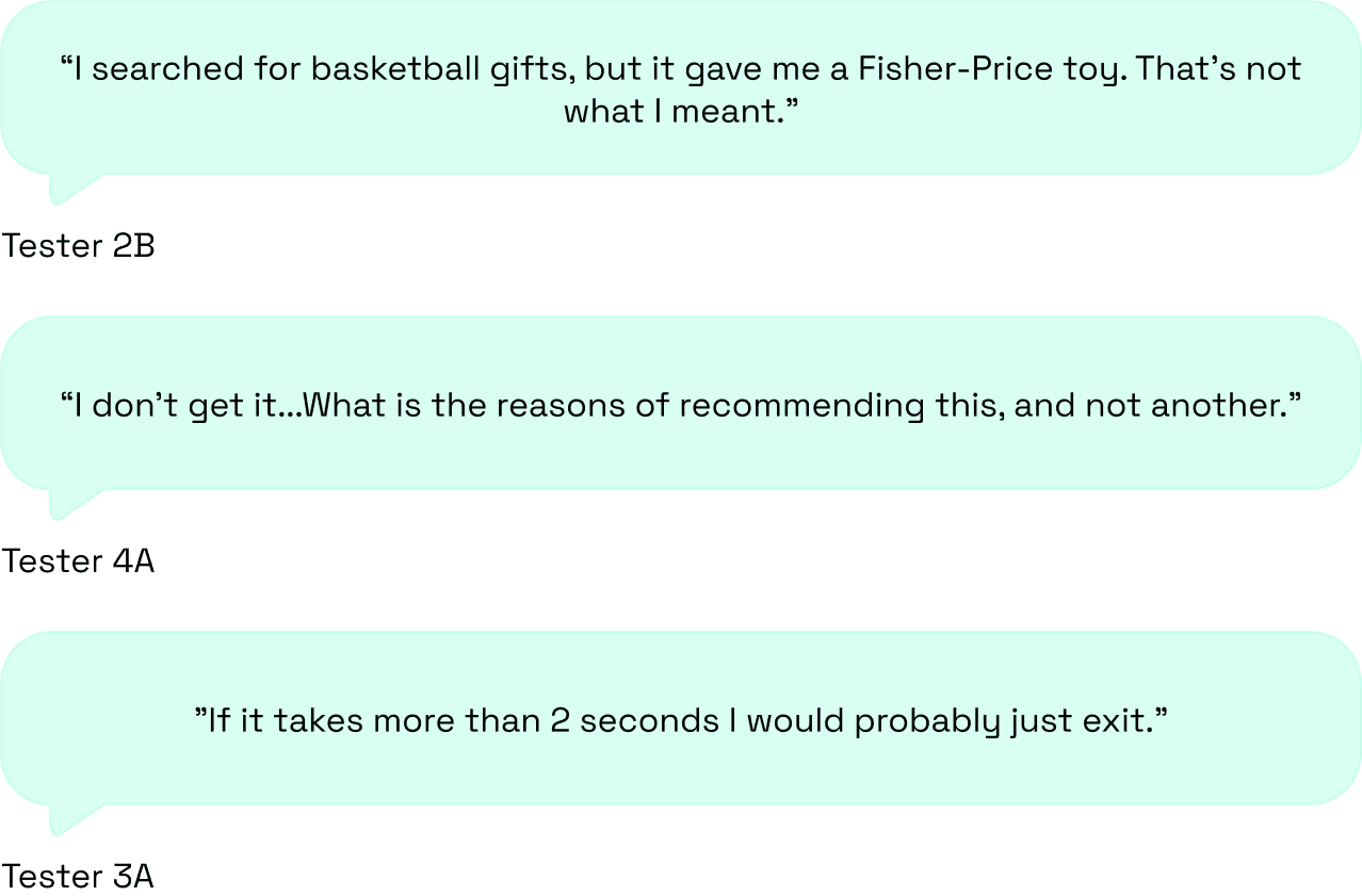 Users didn't mind waiting as long as they could see something was happening. The problem was never the speed, it was not knowing if the platform was even working. | The AI kept trying to guess what users wanted instead of just asking. A simple follow up question would have changed everything. | One bad result was enough to lose the user. Explaining yourself and recovering from mistakes matters just as much as the algorithm itself. |