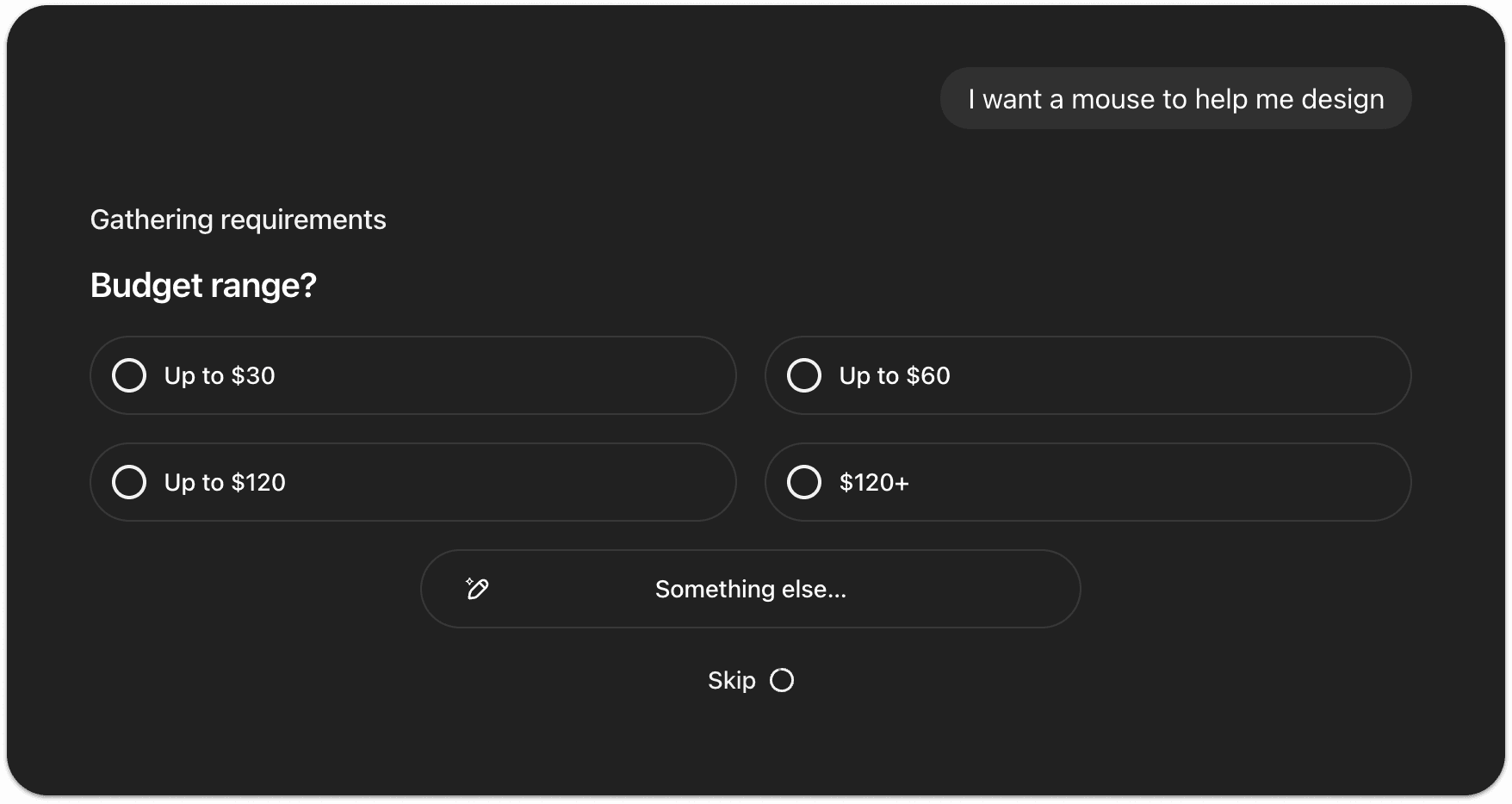 Users got 1-2 results with no prices and nowhere to go from there. Not enough to compare, not enough to decide. Just a dead end. | The AI should ask a quick follow up question before searching. Something like "What's your budget?" or "What color are you looking for?" That's what makes it feel like an assistant, not just a search bar. |